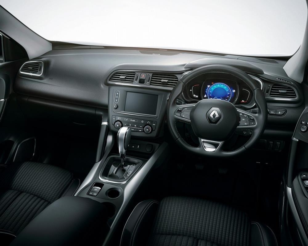高い位置に配されたセンターコンソールと水平を基調にデザインされたダッシュボードに囲まれ、高いアイポイントからの視界も良いルノー カジャーのスポーティで快適なコックピット。
